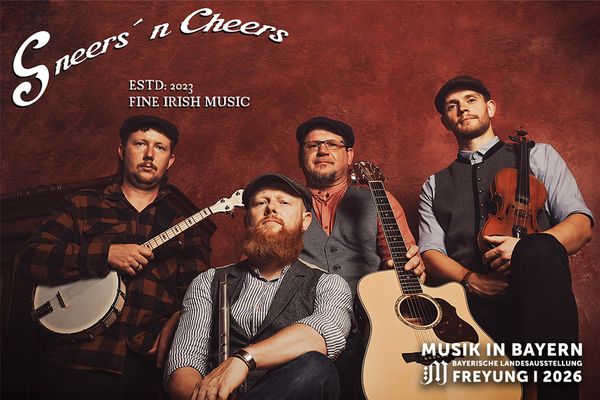 Mit ihrer Leidenschaft für die irische Musik wollen Sneers ’n Cheers dem Publikum einen Einblick in das Lebensgefühl der Grünen Insel geben. Sneers ’n Cheers bedeutet »Hohn und Jubel« und bezieht sich auf die verschiedenen Facetten der irischen Musik. Vom Hohngesang, bei dem die konfliktreiche Vergangenheit Irlands verarbeitet wird, bis zum Jubel auf das wildromantische Land und die Leute, die Irland in der Welt so sympathisch machen. Vor vier Jahren als Zweier-Combo im Wohnzimmer mit Gitarre, Gesang und Whistle gegründet, hat sich die Band Anfang 2023 mit der heutigen Besetzung gefunden. Michael Vogl an Whistle und Bodhrán, Ludwig Weinzierl an Gitarre und Gesang, Andreas Vogl an Banjo und Bouzouki sowie Brian Sally an der Fiddle, Whistle und Gitarre. Als Quartett hat Sneers ’n Cheers seitdem auf Kleinkunstbühnen und bei Kulturveranstaltungen im Raum Passau, Deggendorf und Straubing gespielt und sich einen Namen gemacht. Seit Januar 2026 verstärkt Simon Stiglmeier die Band mit seiner Harmonika und an der Bodhrán. Mit Liedern wie »Wild Rover«, »All for me Grog«, »Whisky in the jar« und »Tell me ma«, laden die vier Niederbayern zum Mitsingen und Mitklatschen ein. »Star of the County Down«, »Spancil Hill« und »Fields of Athenry« sind Lieder fürs Herz. Vom treibenden Pubsong bis zur Ballade ist für alle etwas dabei. Sneers ’n Cheers freuen sich auf euch!